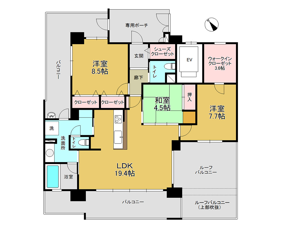 最上階角部屋の分譲マンションの1室。リビング19.4帖。