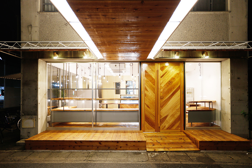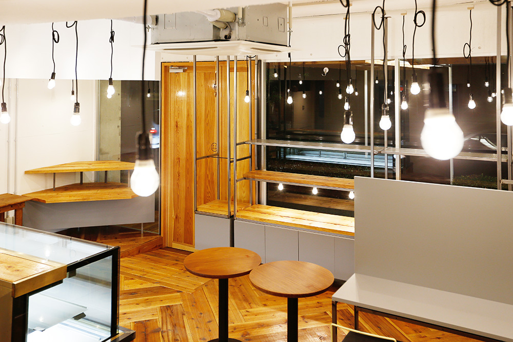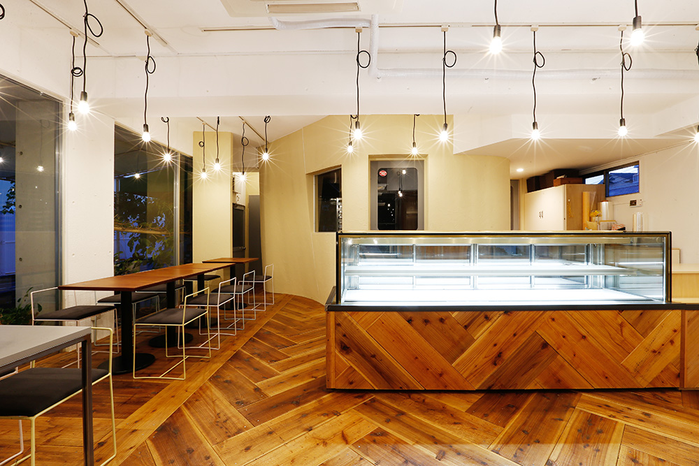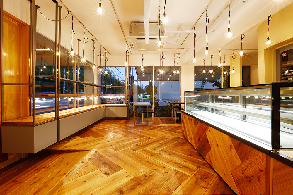 大通りと運動公園に面した大開口の窓を活かし、見通しの良い明るい店内にし、気軽に立ち寄りやすい雰囲気を意識した。今回の改装のメインとなるパン工房は、パン生地の柔らかいイメージをそのまま、3次元曲面の左官仕上げの壁にし、お店の中心にシンボリックに浮かび上がるようにした。LED裸電球を整然と配置し、空間に明るさと立体感を演出。床や什器には、荒い表情のバタ板と鉄骨をクリア塗装して用い、かしこまりすぎないような素材使いを心がけた。